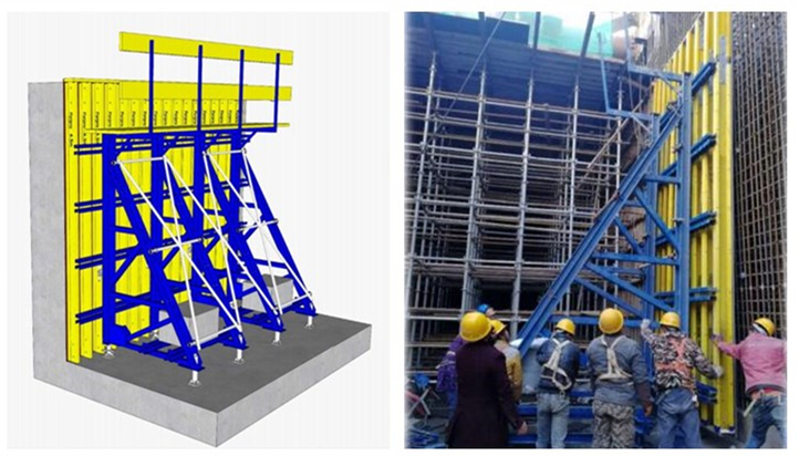 采用定型化模板施工。傳統(tǒng)國內(nèi)地下工程模板支架多采用鋼管架(或碗扣架)+木模板的形式,人材機投入大,安拆周期長,而且搭設(shè)過程中控制細(xì)節(jié)多,質(zhì)量不易保證,安全風(fēng)險大。為此軌道交通項目側(cè)墻施工采用大膠合板+木工字梁+桁架支撐的單側(cè)模板臺車體系。其組裝簡便,利于現(xiàn)場快節(jié)奏的流水施工;整體承載力較大,能抵抗不同混凝土側(cè)壓力;可變高度,可適應(yīng)不同墻體高度;可利用小型輪車進行整體轉(zhuǎn)移,節(jié)省現(xiàn)場塔吊臺班量;采用在板上預(yù)埋錨固裝置,側(cè)墻上無需預(yù)埋,可完全實現(xiàn)清水墻效果。據(jù)統(tǒng)計平均每塊墻板縮短工期約10天。在保證質(zhì)量的同時極大縮短工期。
