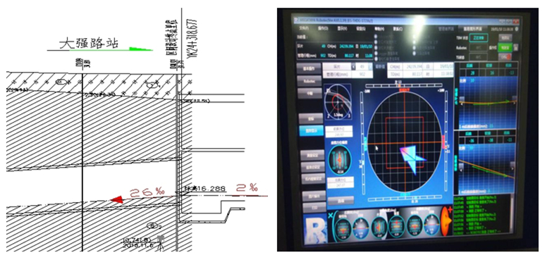 嚴(yán)控盾構(gòu)始發(fā)姿態(tài)。盾構(gòu)始發(fā)姿態(tài)決定了后續(xù)施工成敗,是盾構(gòu)施工重中之重??紤]到盾構(gòu)機自身重心靠前,始發(fā)掘進時易產(chǎn)生向下的“磕頭”現(xiàn)象,項目部將盾構(gòu)始發(fā)軸線比設(shè)計軸線抬高20mm。此外,因車站底板自西向東為2‰縱坡,盾構(gòu)進洞為26‰下坡。按照一般狀況抬高始發(fā)軸線易導(dǎo)致侵限。項目查找合肥市軌道交通前期其他盾構(gòu)隧道施工的經(jīng)驗,結(jié)合大強路站地質(zhì)情況,調(diào)整盾構(gòu)始發(fā)軸線,將盾構(gòu)始發(fā)軸線抬高改為5‰下坡,有效避免了盾構(gòu)管片侵限。