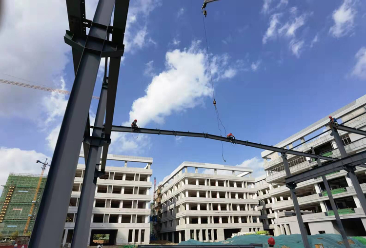 八公司臨廬欣榮農(nóng)民返鄉(xiāng)創(chuàng)新創(chuàng)業(yè)基地建設(shè)項目照常施工,圖為7#、8#樓鋼結(jié)構(gòu)安裝