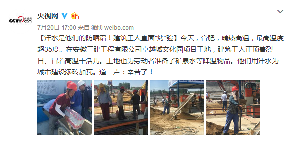 安徽日報、央視網(wǎng)微博——汗水是他們的防曬霜 建筑工人直面“烤”驗