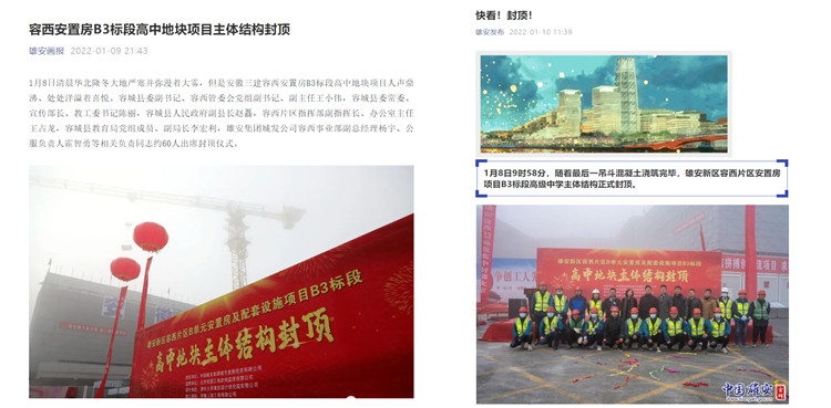 此外,人民雄安網《雄安容西片區(qū)高中封頂、未來可容納1920名學生》、新浪網《雄安新區(qū)容西片區(qū)B3標段高級中學主體結構封頂》、中國雄安官網《看建雄安丨容西片區(qū)B3標段高級中學主體結構封頂》以及河北日報報業(yè)集團、雄安發(fā)布、澎湃新聞等多家媒體官網、公眾號、微博客戶端對此次封頂儀式進行了宣傳報道,贏得點贊紛紛。