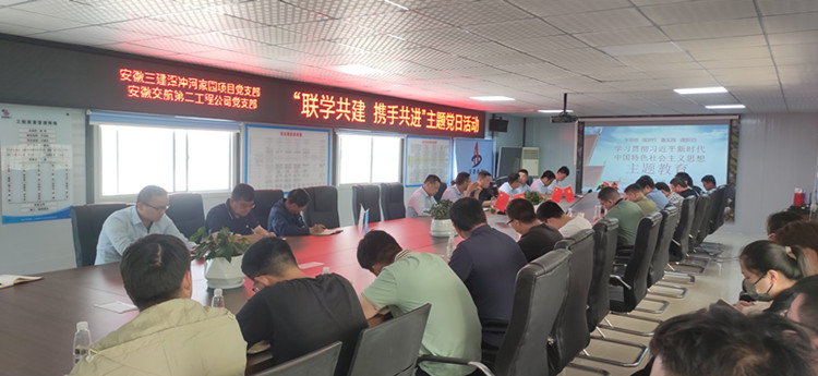 為扎實推進(jìn)學(xué)習(xí)貫徹習(xí)近平新時代中國特色社會主義思想主題教育,進(jìn)一步提升黨建與項目生產(chǎn)經(jīng)營工作深度融合,5月23日下午,安徽三建潭沖河家園項目黨支部聯(lián)合安徽交航第二工程公司黨支部在共同施工的潭沖河家園項目開展“聯(lián)學(xué)共建 攜手共進(jìn)”主題黨日活動。安徽三建四公司、交航二公司黨政負(fù)責(zé)人及項目黨員、部分項目骨干30余人參加活動。