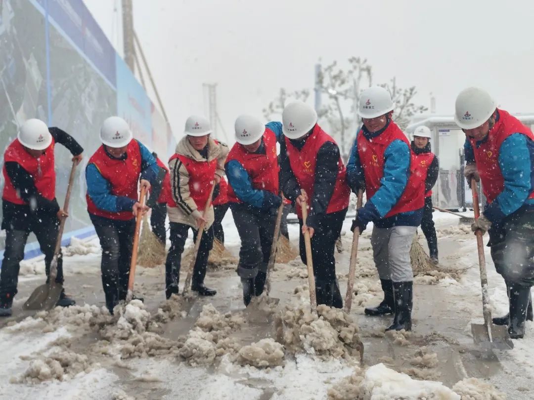 蜀山經(jīng)濟產(chǎn)業(yè)園建設(shè)項目現(xiàn)場,為保障項目的施工進度和現(xiàn)場的施工安全,全體管理人員都參與到清掃施工板面積雪的活動中。