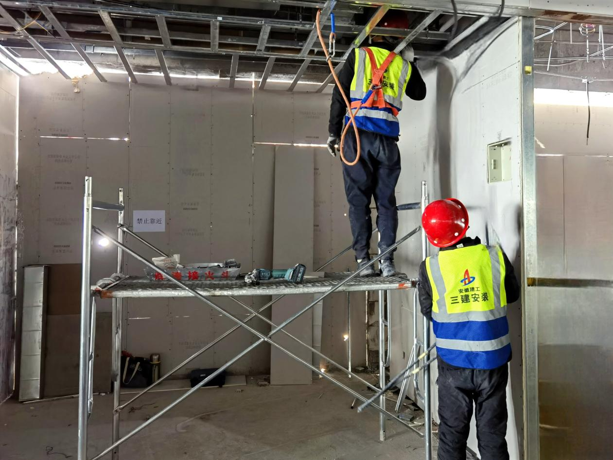 ②4至9層輕鋼龍骨隔墻已完成,吊頂絲桿龍骨完成95%,頂面封板完成90%,地磚鋪貼已完成,衛(wèi)生間防水已完成,墻面裝飾基層已完成,自流平完成30%;