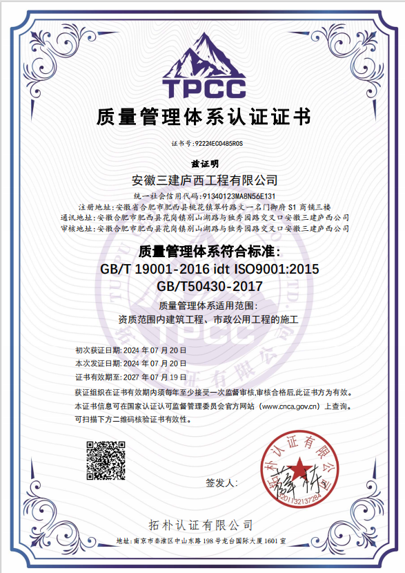三建廬西公司取得質(zhì)量管理等體系認證證書