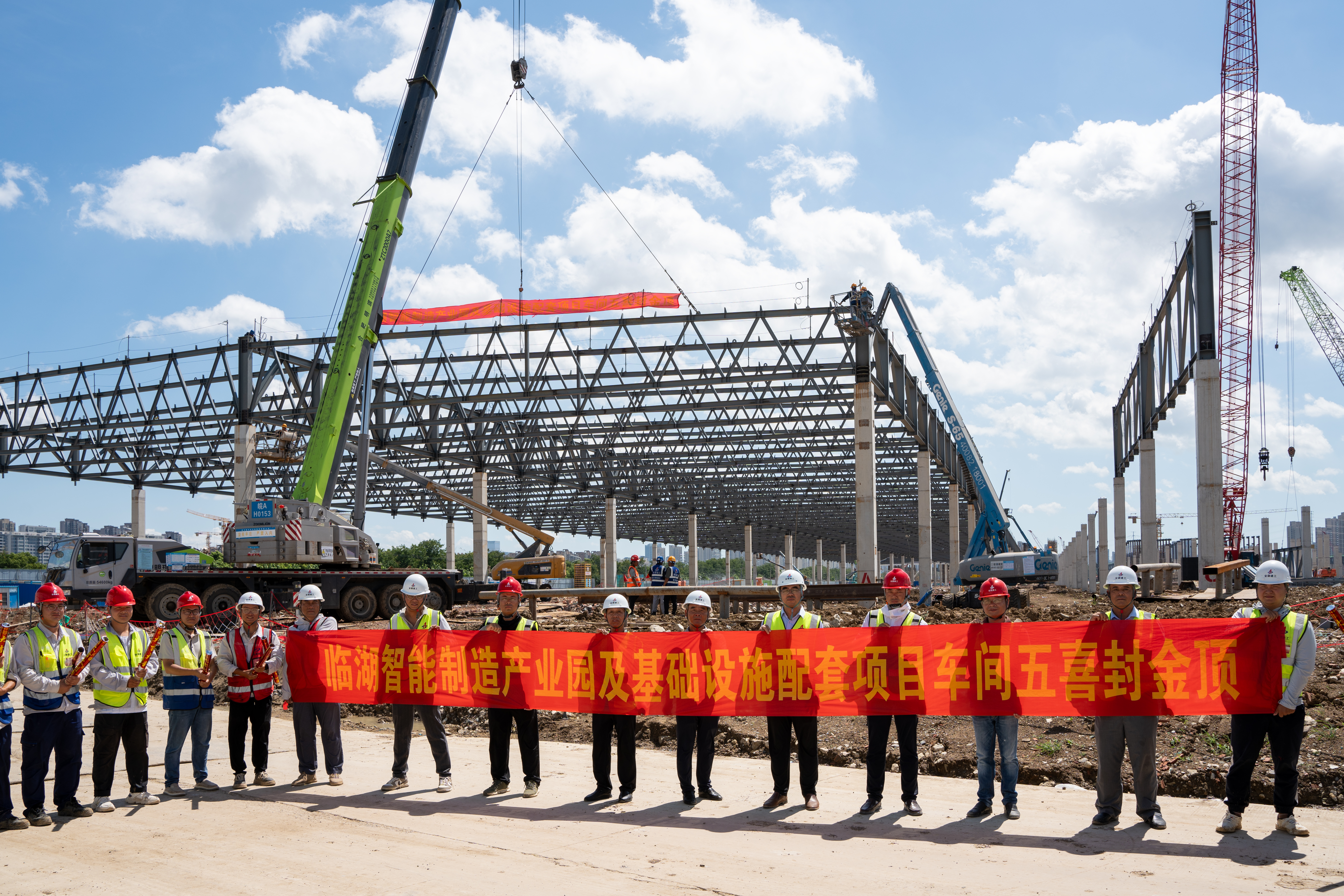 7月28日上午,隨著臨湖智能制造產(chǎn)業(yè)園項目車間五最后一榀鋼桁架完成吊裝,車間五順利封頂,標(biāo)志著車間五正式進(jìn)入室內(nèi)施工階段。