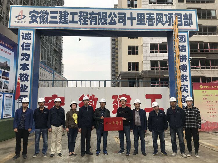 2019年11月6日下午,安徽三建公司工會主席、紀委書記李家保一行前往九公司肥東碧桂園十里春風項目,對該項目申報的安徽三建“工人先鋒號”進行驗評,并予以授牌。