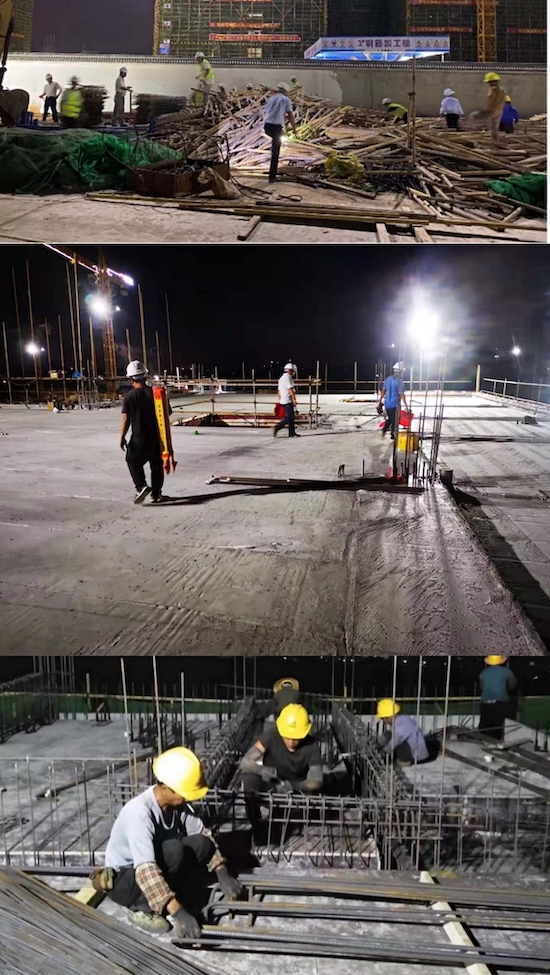 圖為項(xiàng)目管理人員及班組工人雨天搶工