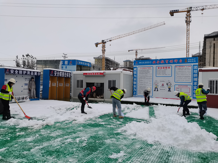 11月6日夜間至7日,雄安新區(qū)出現(xiàn)了強(qiáng)降溫暴雪天氣,雪停后,安徽三建雄安容西片區(qū)安置房項(xiàng)目立刻組織人員清掃積雪,為后續(xù)施工清理出工作面,保障后續(xù)生產(chǎn)。