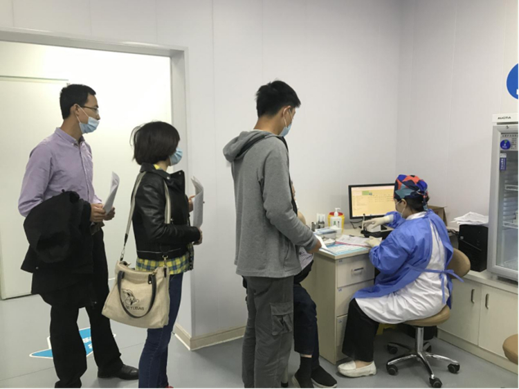 接種人員到達(dá)醫(yī)院后填寫《新冠疫苗接種知情同意書》,并掃描醫(yī)院專屬二維碼登記建檔,經(jīng)簡(jiǎn)易體檢查看是否符合接種要求,確認(rèn)沒問題后再進(jìn)行疫苗接種。在接種完成后留觀區(qū)觀察30分鐘,無異常反應(yīng)后再由專車送回項(xiàng)目。