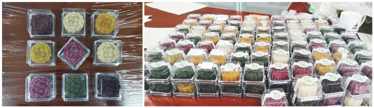 活動現(xiàn)場,大家通過百度搜索,一批毫無烘焙經(jīng)驗的“生產(chǎn)者”,開始學著制作純手工月餅,配比、分餡,包裹、壓模、脫模,在打包時公司領導也積極參與進來,活動中大家你一言,我一語,場面充滿歡聲笑語。經(jīng)過幾個小時的團結(jié)協(xié)作,200多個印有“北城工業(yè)”字樣的專屬月餅就制作完成。制作的月餅光是餡料就有南瓜、香芋、紫薯、紅豆、綠豆、蛋黃肉松、抹茶、荔枝龍井、櫻花、桂花、巧克力等十余種口味,搭配各色的冰皮,現(xiàn)場香味四溢??粗滦∏傻脑嘛灒b入一個個定制的包裝盒,堆成了小山,大家的臉上洋溢著幸福的笑容。剛制作好的月餅還未“返油降糖”,公司的領導班子就表示先要嘗一嘗,“脫模不錯,和我們的構(gòu)建一樣,都不用修補的?!薄拔兜啦诲e,里面的肉松搭配的很好?!甭牭筋I導的一致好評,參與制作的員工都備受鼓舞。