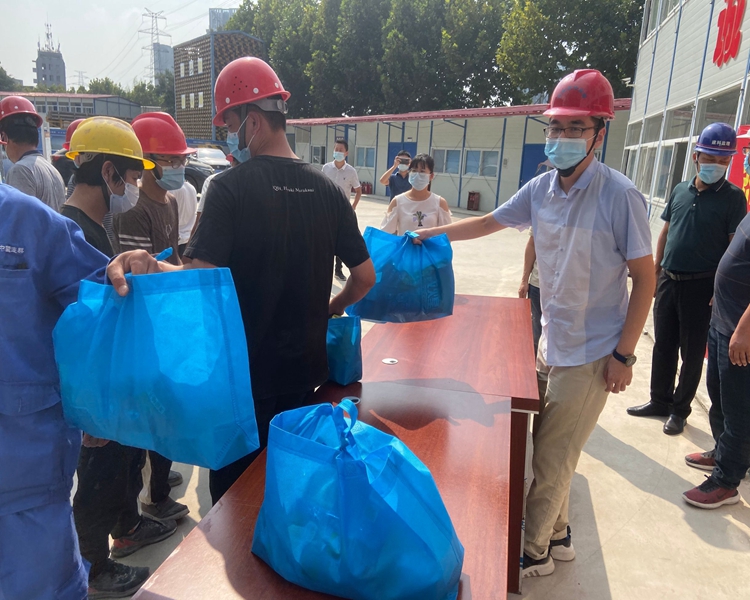 慰問組一行首先來到項目現(xiàn)場,詳細了解了項目建設(shè)進展情況,向他們送上生活用品、防暑降溫用品、綠豆、冰糖、飲料等防暑慰問品,對一線工人們的辛勤付出表示誠摯問候。慰問組強調(diào),“秋老虎”橫行,近期天氣持續(xù)高溫,工人們不畏高溫、堅守崗位,確保了工程進度,非常辛苦。項目部一定要繃緊安全這根弦,牢固樹立“安全第一、質(zhì)量至上”理念,尤其在高溫天,既要抓緊施工保工期,更要確保質(zhì)量和安全;一方面要精心組織施工,合理安排作業(yè)時間,確保項目建設(shè)順利推進;另一方面要關(guān)心關(guān)懷施工工人的生活,為他們提供必要的防暑降溫物品,確保工人們在高溫期間安全生產(chǎn)。