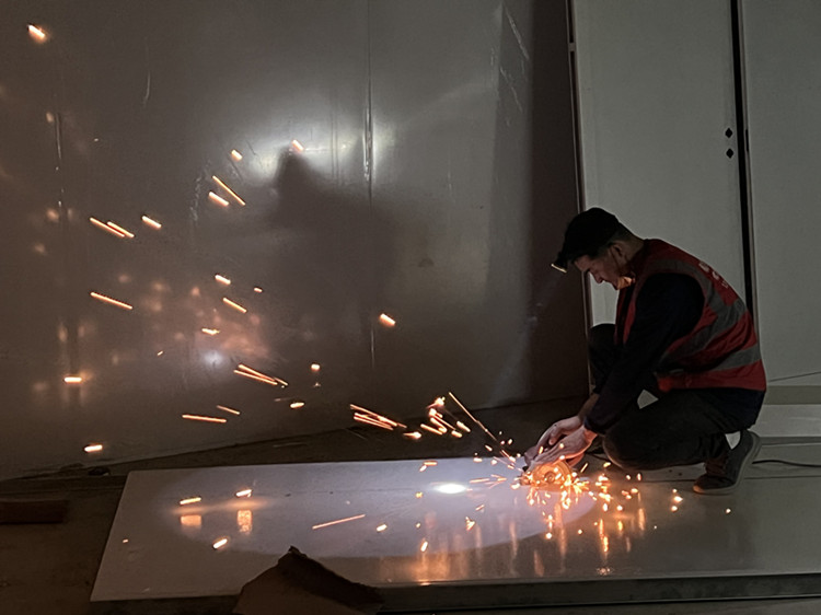 夜幕降臨,合肥春天的夜晚仍夾雜著絲絲涼意,肥西縣疫情隔離點(diǎn)備用區(qū)(三期)工程,塔吊在大功率的光源下仍進(jìn)行著吊裝作業(yè),在吊臂下落的打包箱配件的不遠(yuǎn)處,二公司安全員任杉杉戴著安全帽,向著吊車司機(jī)喊道“慢、慢、慢”,在打包箱房頂配件緩緩落在箱房的支撐點(diǎn)之時(shí),數(shù)名操作工立即手持電動(dòng)機(jī)械找準(zhǔn)各個(gè)支撐點(diǎn)位,用最快速度完成安裝工作。