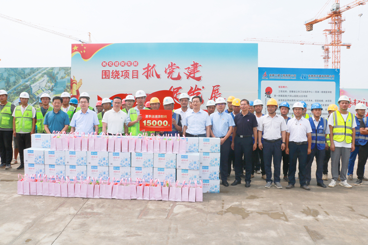 7月26日上午10點(diǎn),蕪湖市委副書記、政法委書記張慶亮,蕪湖市委常委、江北新區(qū)黨工委書記、管委會(huì)常務(wù)副主任姚凱一行赴安徽省公共衛(wèi)生臨床中心(蕪湖)項(xiàng)目施工現(xiàn)場向仍堅(jiān)守一線、辛勤工作的一線職工送上一份“清涼”的慰問,蕪湖公司經(jīng)理呂遠(yuǎn)、副書記陳言軍參加。