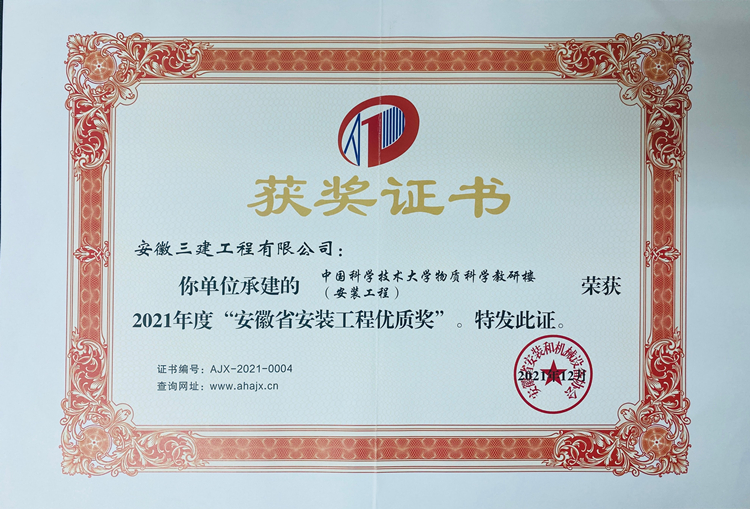 近日,安徽省安裝和機(jī)械設(shè)備協(xié)會(huì)發(fā)布了《關(guān)于公布2022年度“安徽省安裝工程優(yōu)質(zhì)獎(jiǎng)”獲獎(jiǎng)名單的通知》,并頒發(fā)了2021-2022年度安裝工程優(yōu)質(zhì)獎(jiǎng)證書,其中安徽三建承建的“中國(guó)科學(xué)技術(shù)大學(xué)物質(zhì)科學(xué)教研樓(安裝工程)”及“肥東縣政務(wù)服務(wù)中心(安裝工程)”分別榮獲2021年度和2022年度“安徽省安裝工程優(yōu)質(zhì)獎(jiǎng)”。該獎(jiǎng)項(xiàng)是我省安裝行業(yè)工程質(zhì)量的最高榮譽(yù),這也是繼2019-2020年度“合肥市第二人民醫(yī)院”和“安徽創(chuàng)新館”獲評(píng)該獎(jiǎng)后公司連續(xù)四年獲得該獎(jiǎng)項(xiàng),充分體現(xiàn)了安徽三建安裝專業(yè)的雄厚實(shí)力和技術(shù)水平。