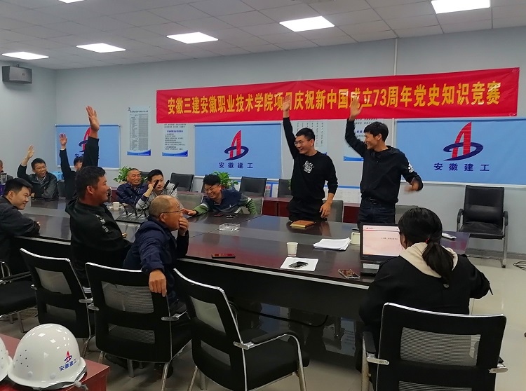 10月1日,滁州天長(zhǎng)恒大項(xiàng)目部組織了“升國(guó)旗唱國(guó)歌”活動(dòng);國(guó)慶當(dāng)晚,江淮學(xué)院項(xiàng)目部組織了“歌唱祖國(guó),慶祝中華人民共和國(guó)成立73周年卡拉OK比賽”,分公司領(lǐng)導(dǎo)班子不僅深入一線與職工們一起引吭高歌,還特地邀請(qǐng)部分職工家屬來(lái)請(qǐng)到項(xiàng)目上,讓聚少離多的他們能夠和家人一起歡度佳節(jié);10月5日,安徽職業(yè)技術(shù)學(xué)院實(shí)訓(xùn)中心項(xiàng)目部開(kāi)展了“慶祝新中國(guó)成立73周年黨史競(jìng)賽”活動(dòng)。