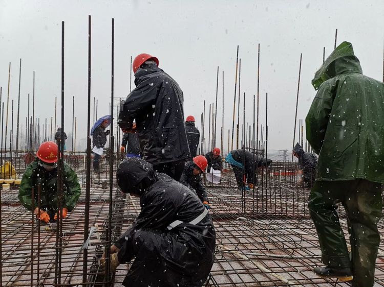 12日8日上午,地處浙江杭州灣之濱的余姚市迎來了今冬的第一場雪。刺骨的寒風(fēng)夾帶著雪花紛紛揚(yáng)揚(yáng)飄在安徽三建余姚項(xiàng)目的工地上。為了按期完成搶工任務(wù),工人們和項(xiàng)目管理人穿雨衣,冒雪奮戰(zhàn)操作面上,熱火朝天的大干,風(fēng)雪阻擋不住三建大干的決心。