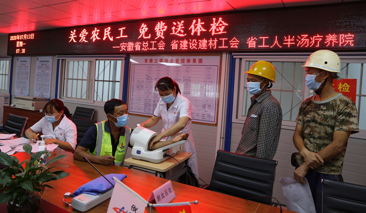7月13日,由安徽省總工會(huì)組織,省建設(shè)建材工會(huì)、省工人半湯溫泉療養(yǎng)院承辦的“關(guān)愛(ài)農(nóng)民工、免費(fèi)送體檢”活動(dòng)來(lái)到安徽三建合肥市中心圖書(shū)館項(xiàng)目,為項(xiàng)目近120名現(xiàn)場(chǎng)農(nóng)民兄弟工進(jìn)行了體檢。