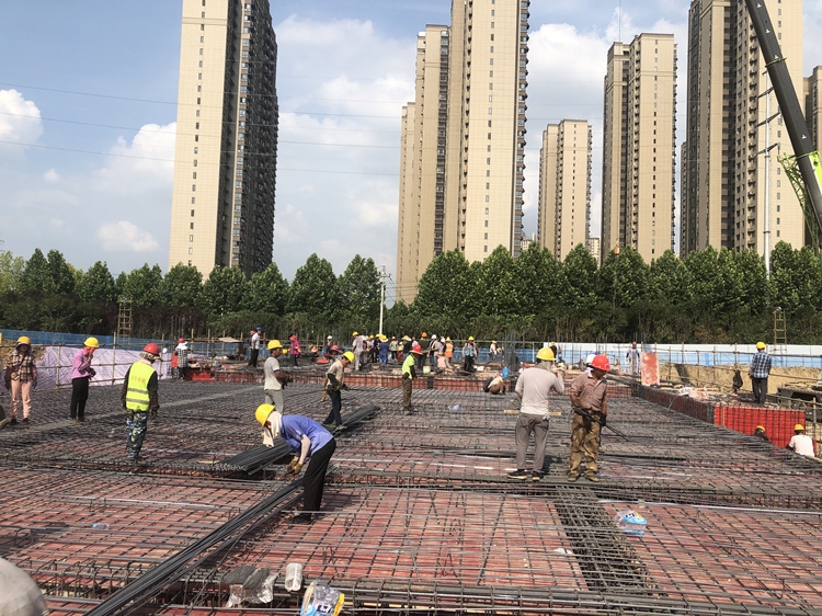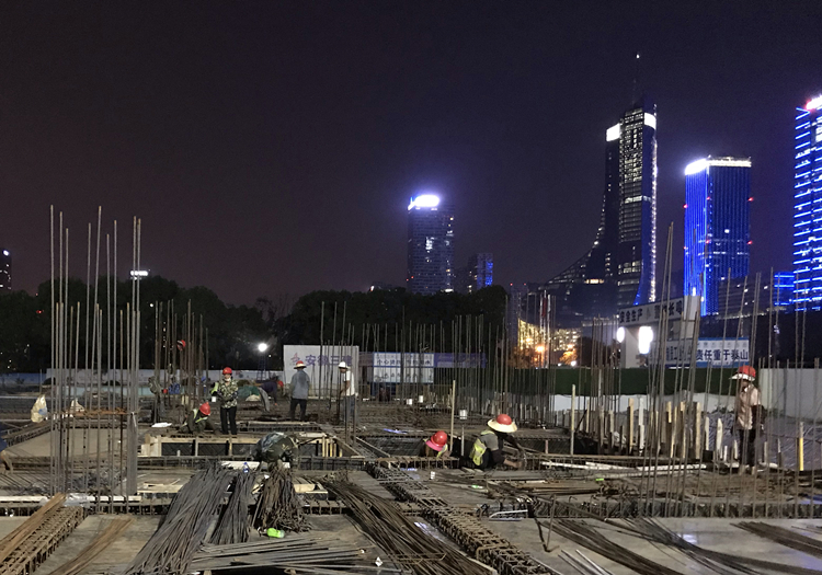 合肥市中心圖書(shū)館項(xiàng)目是合肥市重點(diǎn)工程,為保證施工進(jìn)度,項(xiàng)目部不僅備好涼白開(kāi)、礦泉水、綠豆湯、還有仁丹等解暑物品,錯(cuò)開(kāi)上午10點(diǎn)至下午3點(diǎn)白天高溫時(shí)間段進(jìn)行施工,還將農(nóng)民工學(xué)校教室及會(huì)議室空調(diào)全天開(kāi)啟,以備工人休息使用。圖中是在華燈初上的天鵝湖畔,廣大工人師傅正在進(jìn)行地庫(kù)鋼筋綁扎及外架搭設(shè)工作。