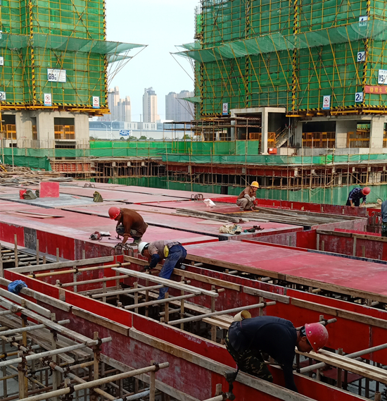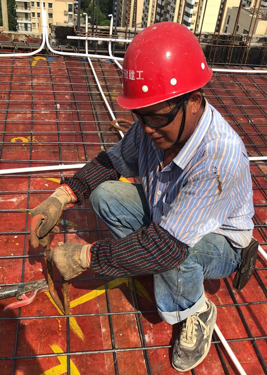 華力勞務(wù)公司中海新站區(qū)27#售樓部項(xiàng)目現(xiàn)場(chǎng),鋼筋師傅正在烈日下綁扎鋼筋