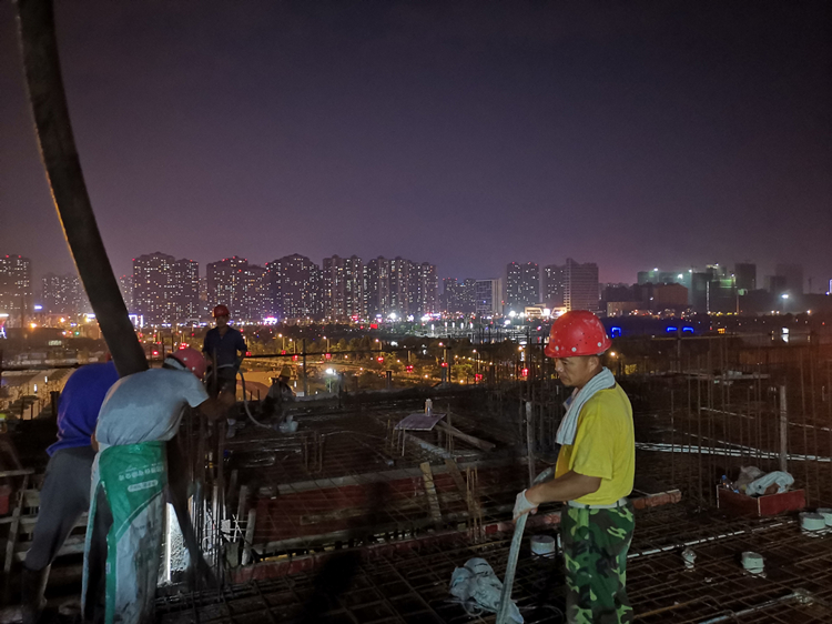 為避免日間高溫作業(yè),六公司亳州三巽公園里項(xiàng)目合理調(diào)整作業(yè)時(shí)間,組織工人夜間施工,圖為8月4日夜間項(xiàng)目澆筑混凝土