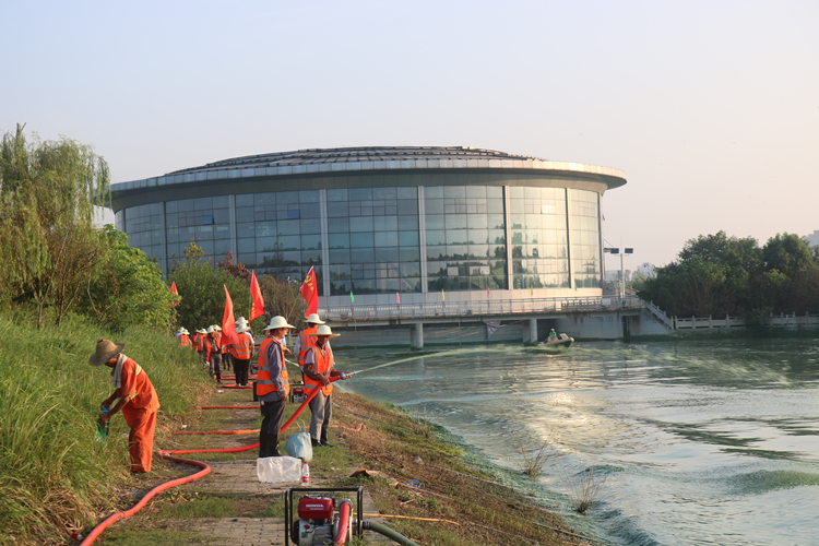 當(dāng)天,一大早,70多名黨員、職工就趕到巢湖環(huán)湖北路塘西河大橋邊,現(xiàn)場(chǎng)成立了三支黨員突擊隊(duì),大家頭頂烈日,冒著37攝氏度的高溫,投入到治理藍(lán)藻攻堅(jiān)戰(zhàn)中。大家沿湖開展集中作業(yè),連續(xù)抽取湖水投放殺藻劑或絮凝劑,再排放回湖中。在藍(lán)藻治理活動(dòng)中,廣大黨員、團(tuán)員勇當(dāng)先鋒,連續(xù)工作12小時(shí), 大家的工作服干了又濕,濕了又干。十二公司青年黨員曾祥軍同志說:“八百里巢湖是合肥的名片,是合肥市寶貴的自然資源,能夠參與到巢湖藍(lán)藻治理中,做保衛(wèi)環(huán)境的戰(zhàn)士,義不容辭”。